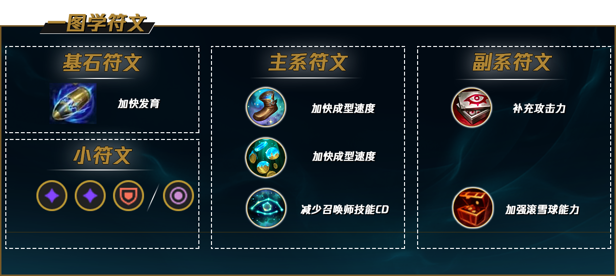 如果对面整体偏脆,就可以带先攻这套符文,出穿甲装备,副系寻宝猎人,利用前期抓人的强势让自己的装备成型特别快,中期1套就能秒脆皮,打团如果打满aoe一波能偷几百块钱。