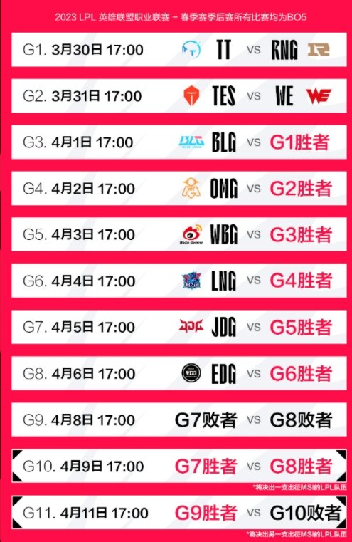 2023LPL春季赛常规赛已经结束,在经历了十周赛事的激烈争夺后,JDG、EDG、LNG、WBG、BLG、OMG、TES、TT、RNG以及WE共十支队伍成功打入了季后赛。而在2023年3月30日这一天,LPL春季赛将开启季后赛新的征程,这十支队伍将向春季赛冠军以及MSI资格发起新的挑战。