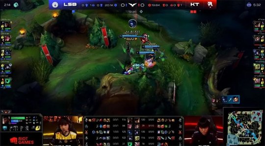 前期两队打野的gank节奏难分高下:蔚刷到6级gank上路,越塔强杀了纳尔,LSB中野则双游下路,越塔四抓二打出0换2完全不亏。KT下路组复活之后换线到中路,掩护蔚拿到峡谷先锋。LSB打小龙时被发现,奎桑提赶来劝退了LSB,KT凭借人数优势控下火龙,放出先锋撞掉LSB下路一血塔。14分钟KT在上路河道留下了锤石,随后机器人在中路钩回阿狸,想救队友的厄斐琉斯被泽丽闪现带走,阿狸反而依靠秒表和闪现R逃过一劫,LSB中路一塔告破,猴子拿到第二只先锋作为止损。