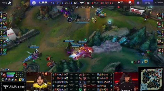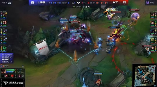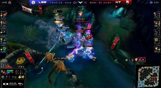 站在悬崖边上的LSB继续选择保下路的战术,厄锤组合也是前期LSB三路唯一手握线权优势的。KT对此心知肚明,一直对下路施压:赵信3级直接gank下路,打出锤石的闪现,随后洛和厄斐琉斯互换了闪现。LSB本应利用下路的线权优势控下小龙,不料Kiin的石头人放弃了兵线,走到下路支援队友,KT全员集结控下海克斯小龙。