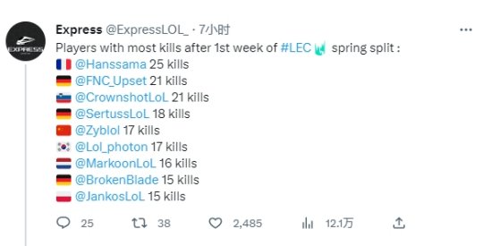 LEC春季赛首周比赛已经结束,今日外媒分享春季赛首周选手击杀榜单,G2下路选手Hans sama位列榜首,VIT上下野(Upset、Bo、Photon)进入前五。