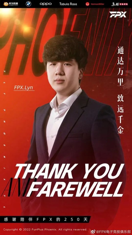 经过俱乐部与本人充分且友好的沟通与协商,金达彬(Kim Dabin/ID:Lyn)与FPX英雄联盟分部正式解除合约,卸任副教练一职。