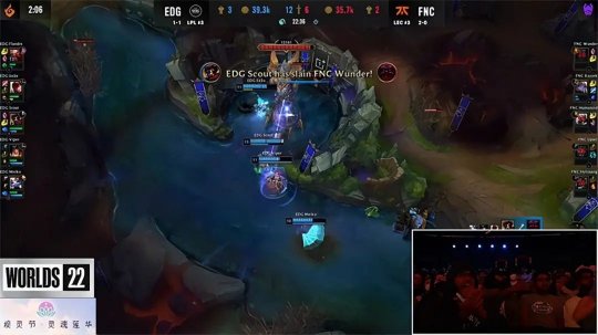 2022英雄联盟全球总决赛小组赛第三天第三场比赛由EDG战队对上FNC,FNC开局贸然的入侵送给希维尔两个人头,导致卡莉丝塔对线期完全没有能打出效果,EDG紧密围绕下路展开运营取得了优势,但是在中期面对Humaniod的沙皇也陷入了比较胶着的苦战,好在EDG沉住气稳住阵脚,利用团战的极致配合与拉扯最终正面击溃了FNC的防线,有惊无险地拿到了他们的第二场胜利。