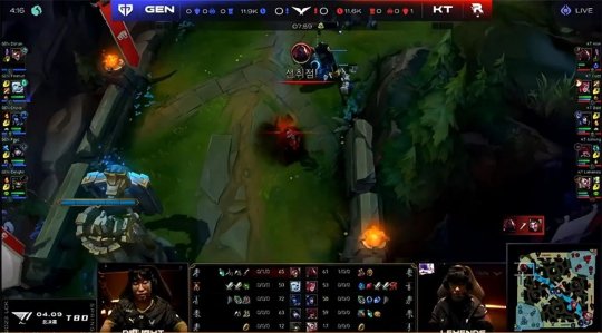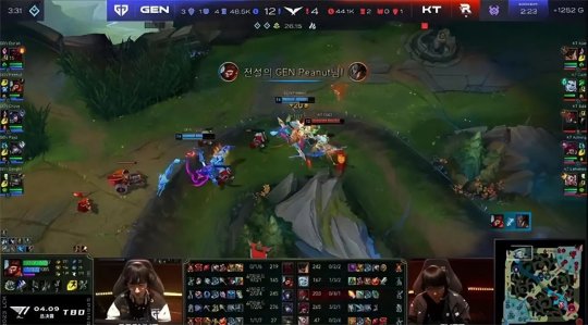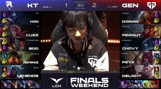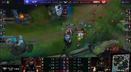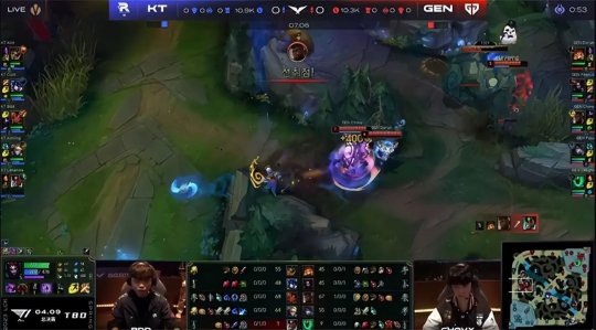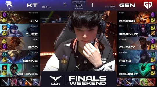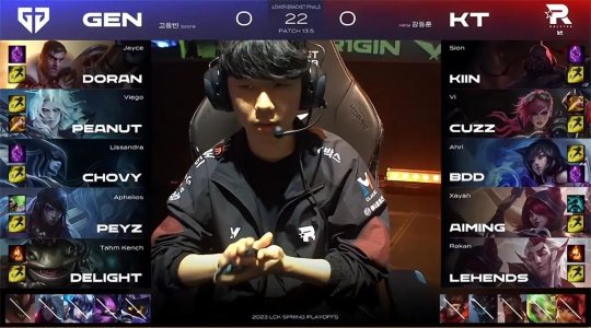 中期赛恩单带下路时摇来霞灵性gank了一波,越GEN下路二塔强杀了杰斯,霞吃到人头和防御塔的经济,发育领跑全场。24分钟双方在小龙河道展开拉扯,丽桑卓交出秒表加大招换了赛恩和霞洛组合的三个大招,GEN逼出赛恩的闪现后本来呈追击之势,不过塔姆突然切进KT后排试图留人,GEN的阵型反而脱节,KT各个击破打出0换3,如愿将大龙收入囊中!GEN上路高地塔告破,经济落后4千。最终GEN选择在中路强开坦度无解的赛恩,KT双C无人限制输出拉满,摧枯拉朽打出1换4一波结束比赛,有惊无险1-0先下一城!