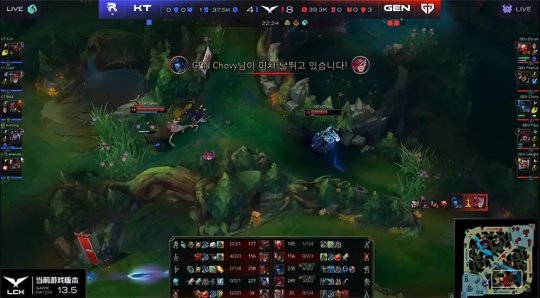 这一把前期的线权情况可谓风水轮流转:KT中、下两路手握线权,同时鳄鱼在上路灵性卡线,不给纳尔补刀的机会,升到5级还交进攻闪现打出纳尔的闪现。KT下路组回城后卡尔玛游走了一波上路,虽然发现了反蓝buff的蜘蛛,但没想到GEN上、中都在附近,奎桑提拿到卡尔玛的一血。KT上中野晚来一步,GEN三人得以全身而退。