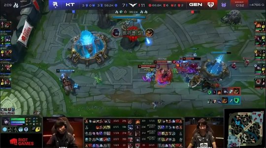 卡牌飞下路虽然帮队友建立了优势,但牺牲了自己的发育,阿狸得以手握线权,猴子顺势控下炼金小龙,作为交换佛耶戈拿到峡谷先锋。KT上、下路率先进行了换线,GEN上辅双游中路三抓一,卡牌丝血闪现极限逃生,同时霞和石头人都吃到了GEN边线一塔的镀层,发育节奏良好。GEN继续贯彻抱团抓单的战术,在上路先后击杀了霞洛组合加佛耶戈三人,稳住了前期局势。13分钟双方在小龙河道展开拉扯,佛耶戈拼惩戒抢到风龙,石头人开大只撞到奥恩一人,GEN打出一波惨烈的3换4,放出第二只先锋推掉中路一血塔,KT则掩护霞单吃了下路一塔。