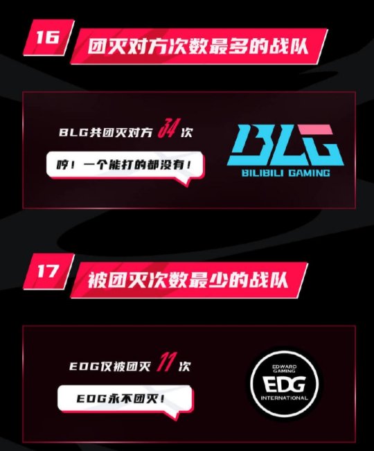 今日LPL官方分享春季赛巅峰数据,其中EDG以11次的数据成为春季赛被团灭次数最少的队伍,而BLG以34次的数据成为春季赛团灭对手次数最多的队伍。