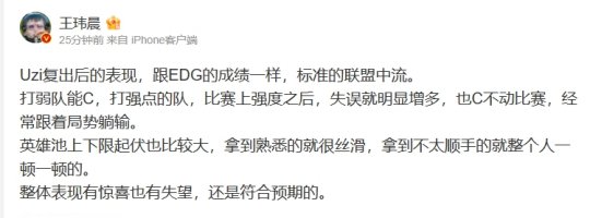 体坛周报记者发博,谈及UZI在EDG复出的表现: